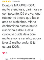 ○ O que é a consulta online e o que ela não substitui? O termo consulta online é usado apenas para entendimento do tutor e deve ser realizado mediante avaliação presencial prévia. Caso seu pet não tenha passado pela consulta presencial com a Dra Quézia, ela fará teleorientação e teletriagem, te guiando para os próximos passos dependendo do caso. Não substitui a consulta presencial, exame físico, não atende emergências.